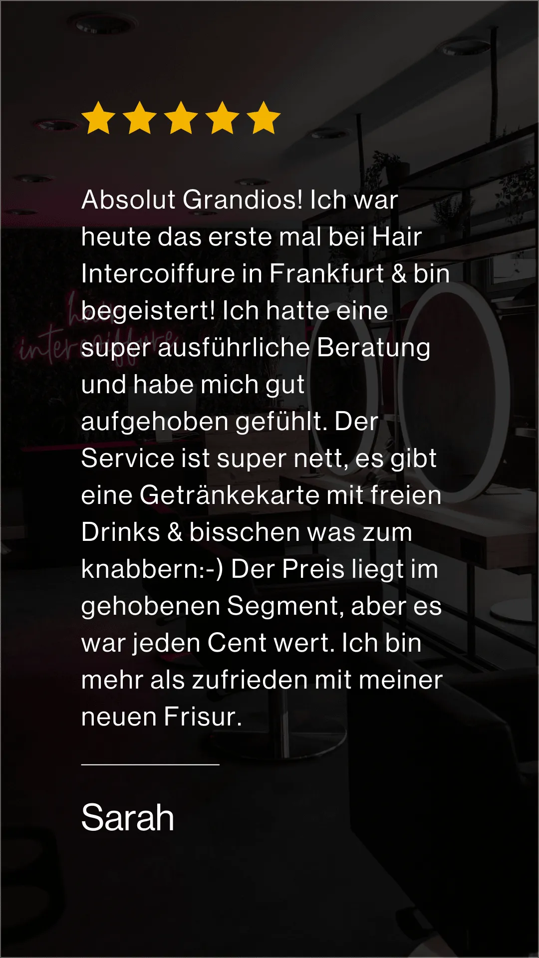 Absolut Grandios! Ich war heute das erste mal bei Hair Intercoiffure in Frankfurt & bin begeistert! Ich hatte eine super ausführliche Beratung und habe mich gut aufgehoben gefühlt. Der Service ist super nett, es gibt eine Getränkekarte mit freien Drinks & bisschen was zum knabbern:-) Der Preis liegt im gehobenen Segment, aber es war jeden Cent wert. Ich bin mehr als zufrieden mit meiner neuen Frisur. Liebe Grüße Sarah