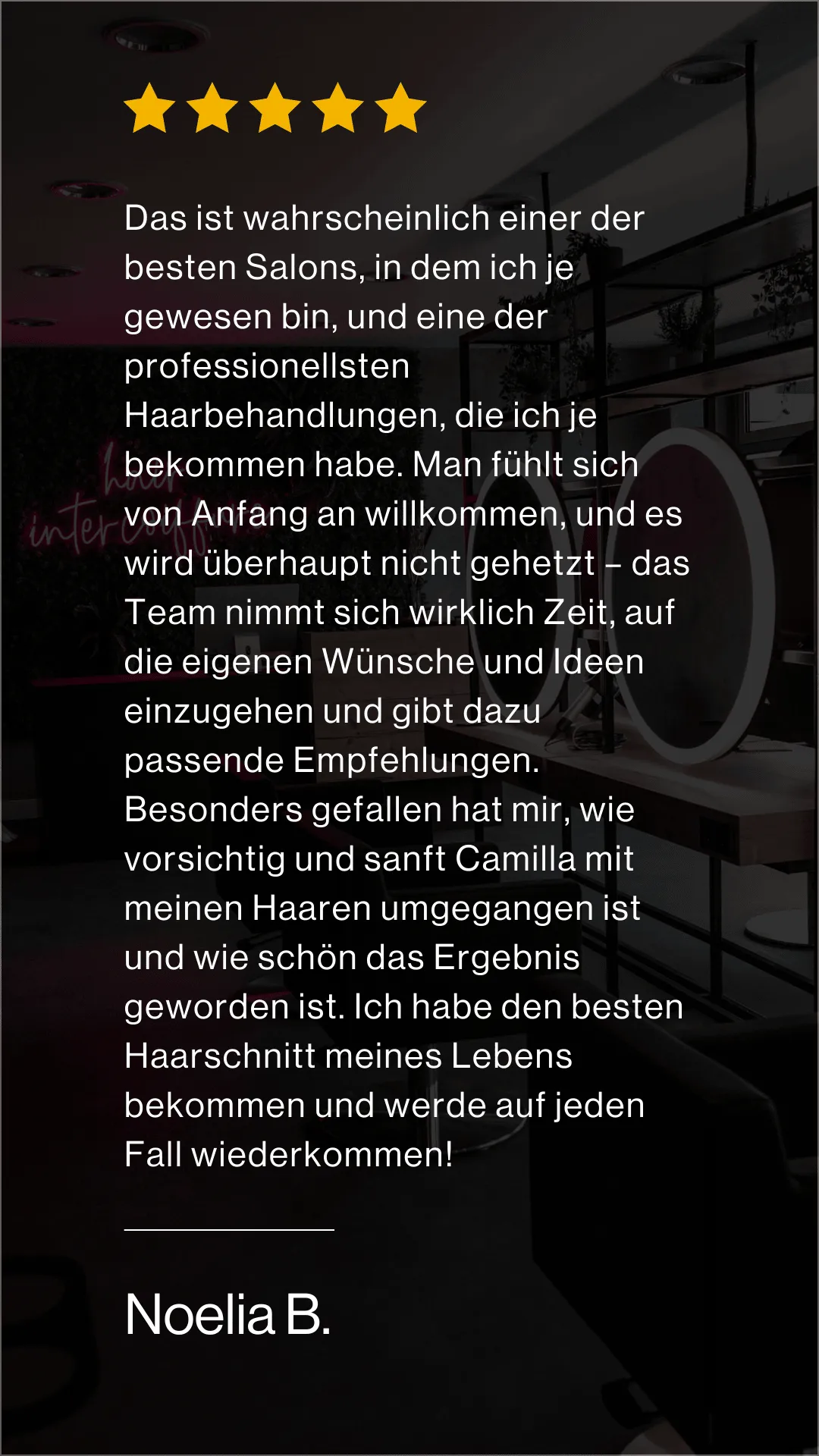 Das ist wahrscheinlich einer der besten Salons, in dem ich je gewesen bin, und eine der professionellsten Haarbehandlungen, die ich je bekommen habe. Man fühlt sich von Anfang an willkommen, und es wird überhaupt nicht gehetzt – das Team nimmt sich wirklich Zeit, auf die eigenen Wünsche und Ideen einzugehen und gibt dazu passende Empfehlungen. Besonders gefallen hat mir, wie vorsichtig und sanft Camilla mit meinen Haaren umgegangen ist und wie schön das Ergebnis geworden ist. Ich habe den besten Haarschnitt meines Lebens bekommen und werde auf jeden Fall wiederkommen!