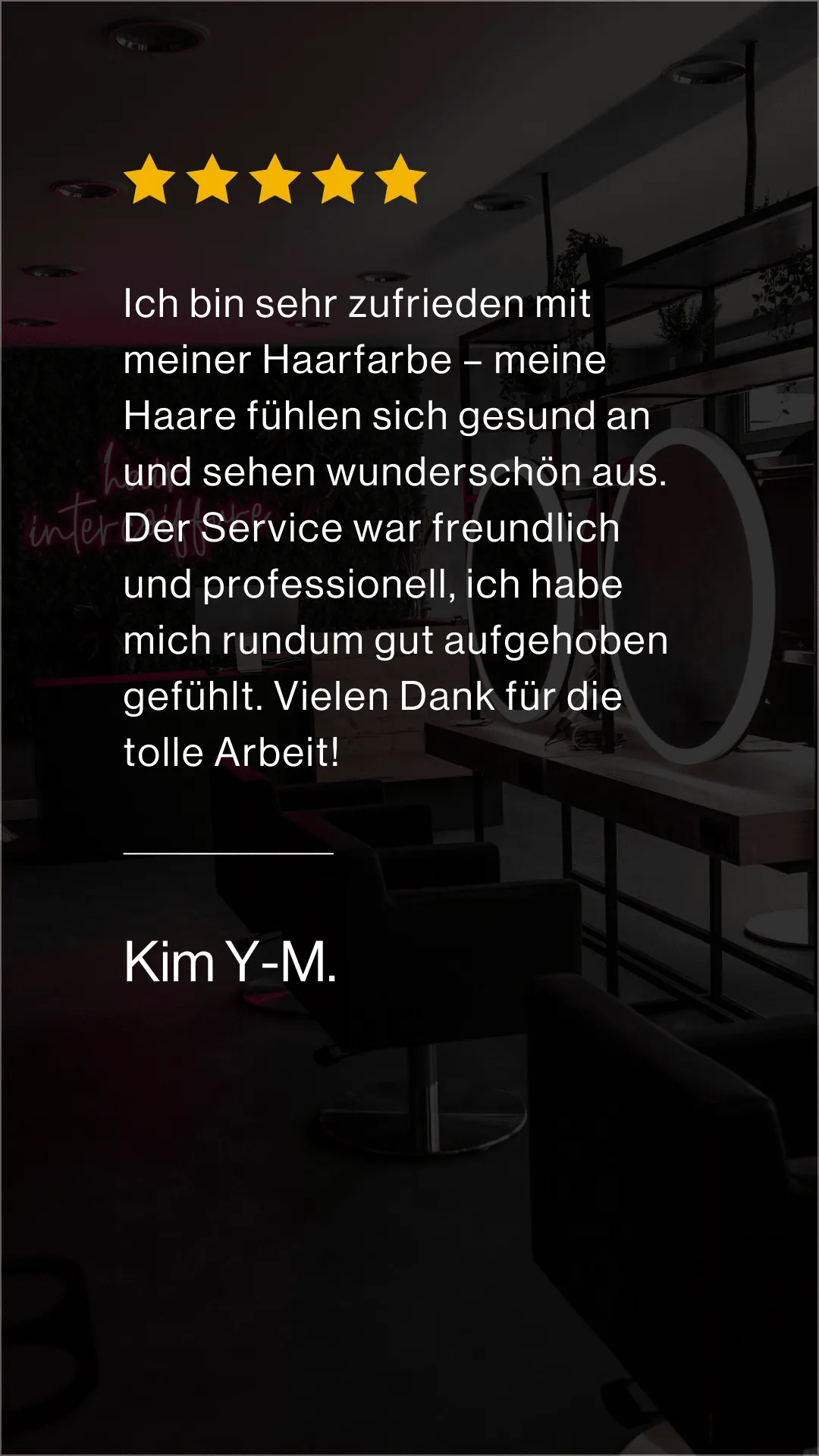 Ich bin sehr zufrieden mit meiner Haarfarbe – meine Haare fühlen sich gesund an und sehen wunderschön aus. Der Service war freundlich und professionell, ich habe mich rundum gut aufgehoben gefühlt. Vielen Dank für die tolle Arbeit!